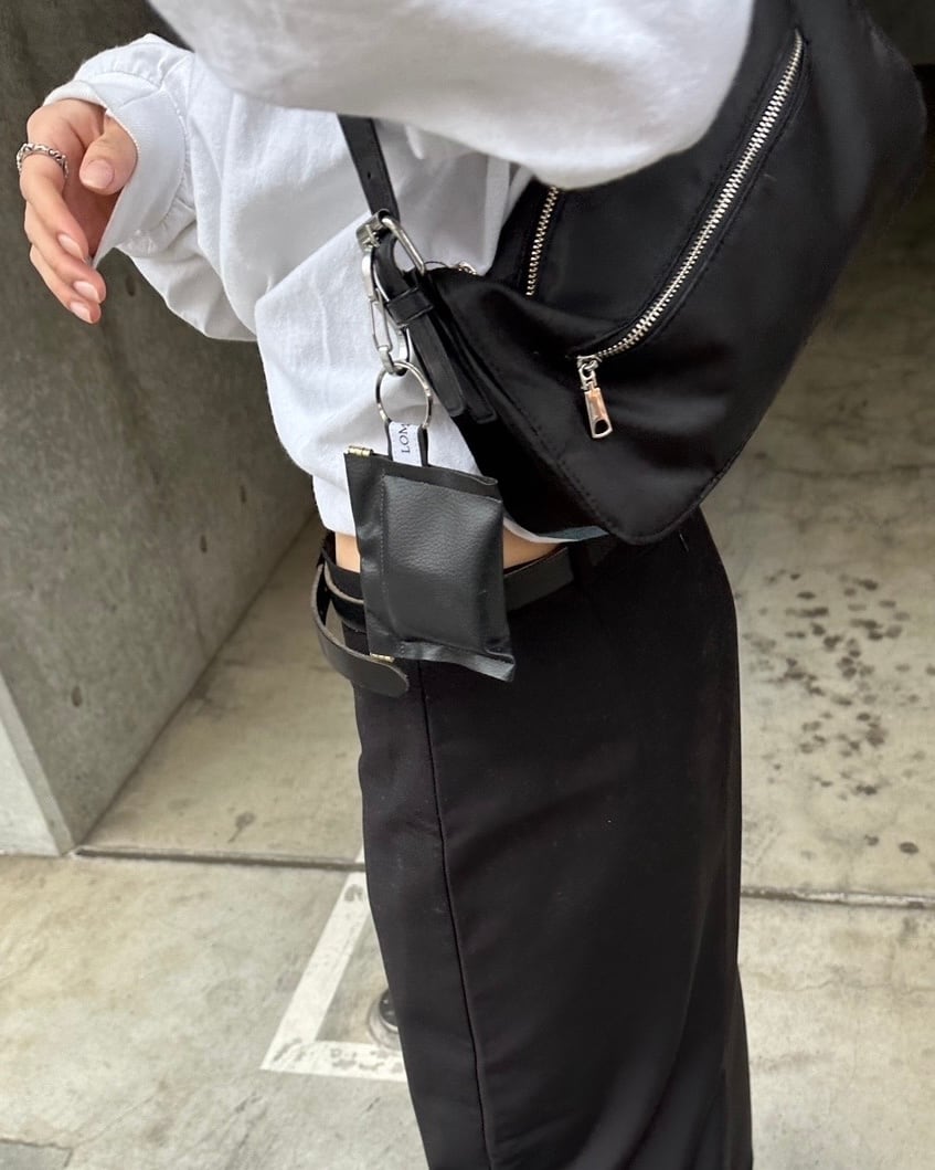 イヤホン、リップ、鍵など小物が収納でき、鞄やベルトループに引っ掛けれるように丸カンを採用しました。