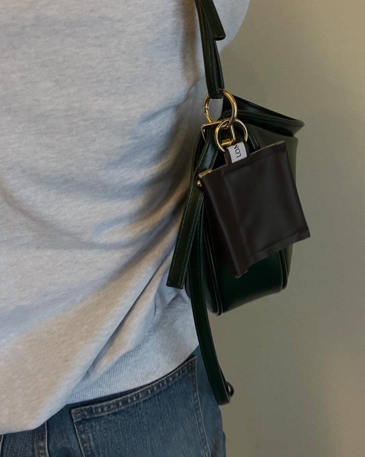 イヤホン、リップ、鍵など小物が収納でき、鞄やベルトループに引っ掛けれるように丸カンを採用しました。