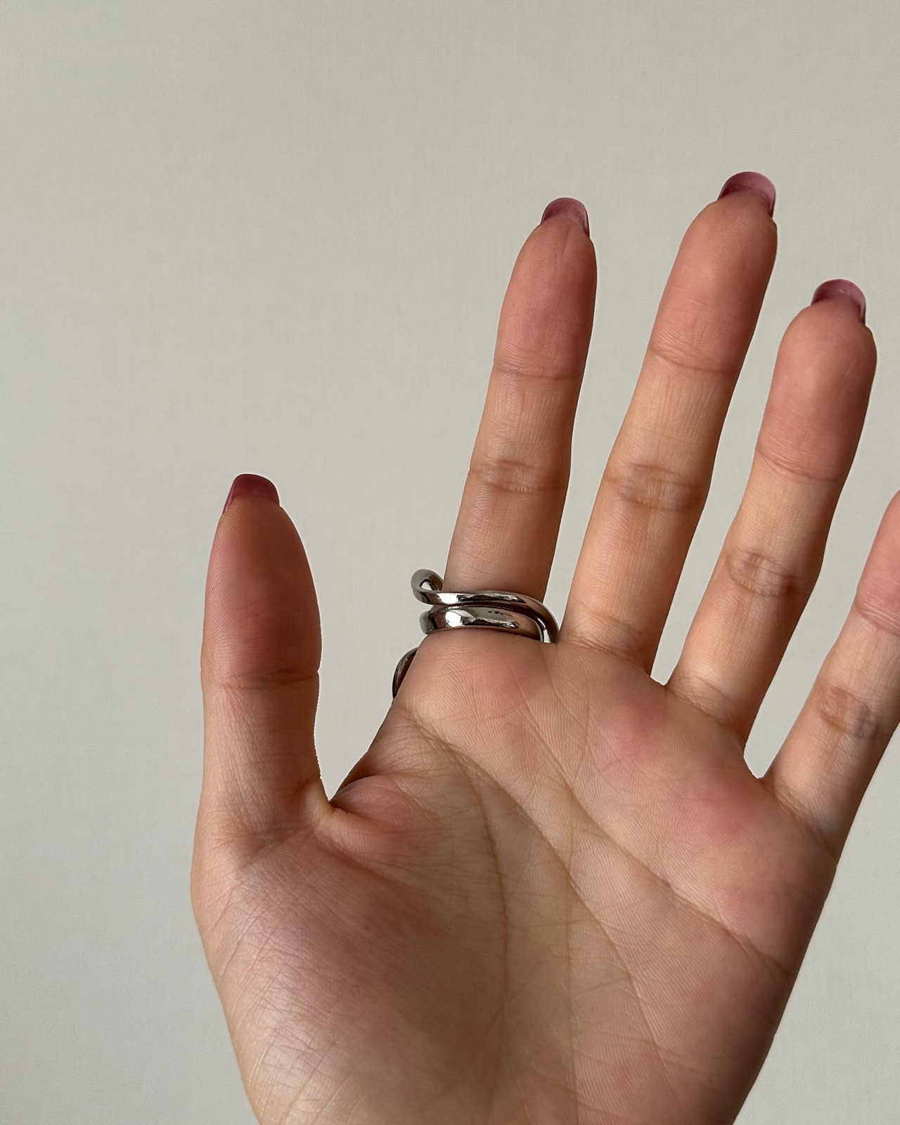 シンプルな中にひとくせあるフォルムで、スタイリングに印象を加えるリング。