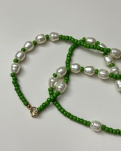 色鮮やかなグリーンカラーが目に止まるビーンズネックレス。